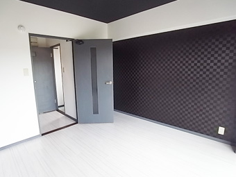 替え、壁の側面に一部だけ市松模様のアクセントクロスを入れることにより、若者向けでおしゃれなお部屋に仕上がりました! お部屋の形が横に広い長方形なので、ちょっと違った家具等の配置ができ、こだわってインテリアを楽しめます。